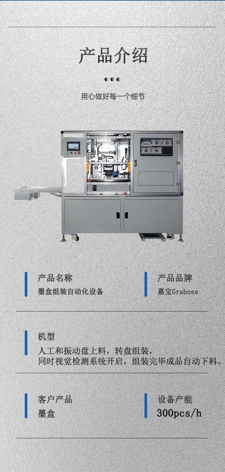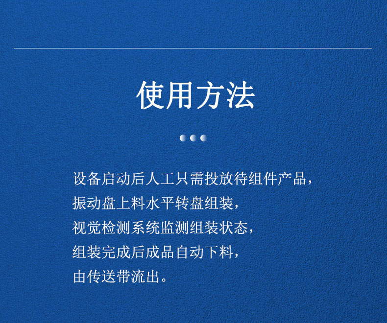 設備啟動后人工只需投放待組件產品,振動盤上料水平轉盤組裝,視覺檢測系統監測組裝狀態,組裝完成后成品自動下料,由傳送帶流出。