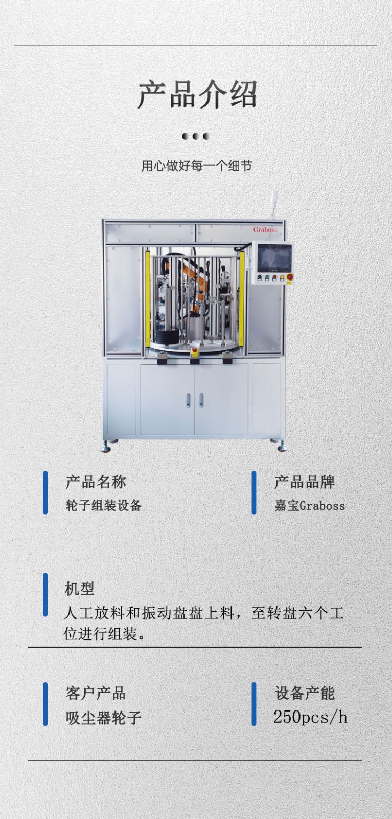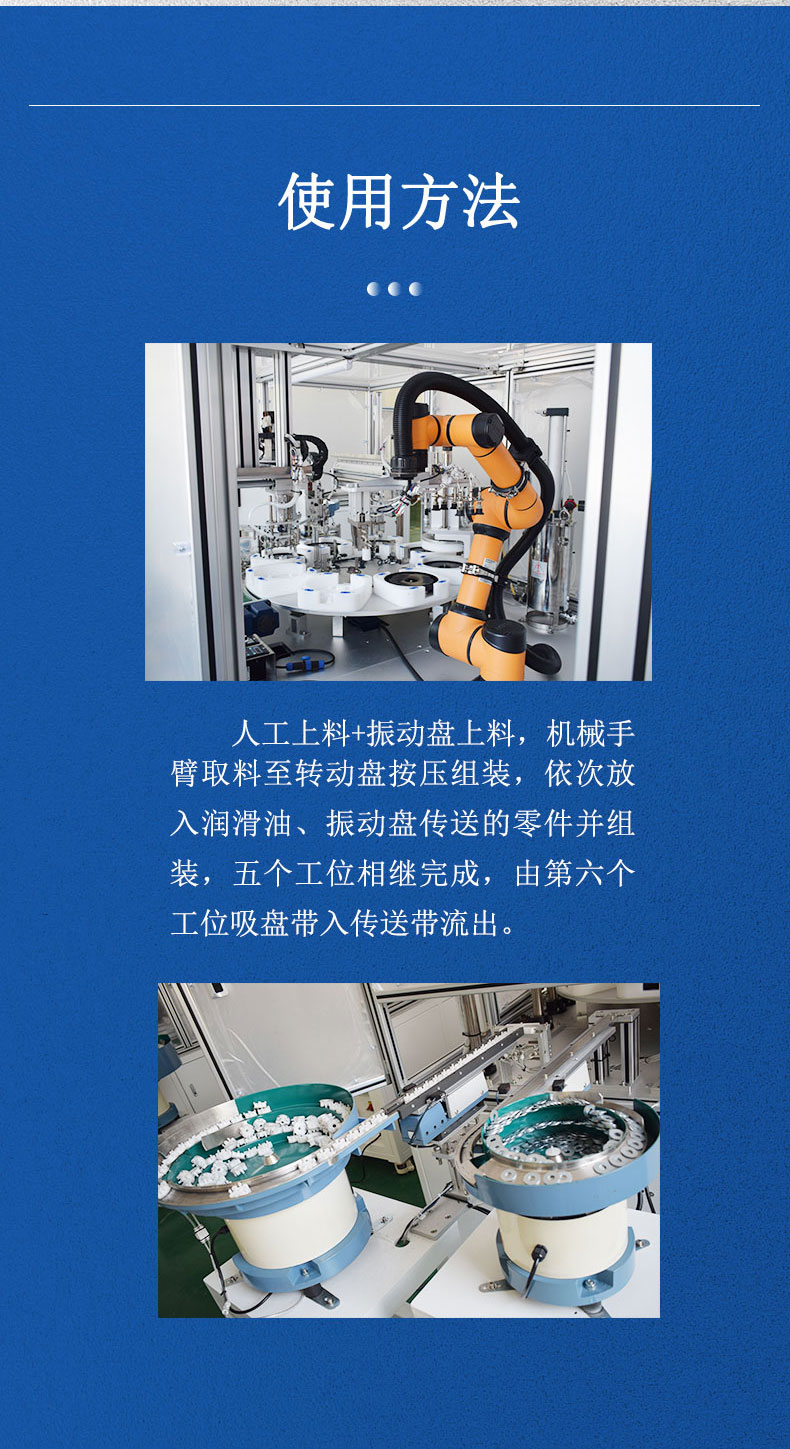 自動組裝吸塵器輪子,人工上料+振動盤上料,機械手臂取料至轉動盤按壓組裝,依次放入潤滑油、振動盤傳送的零件并組裝,五個工位相繼完成,由第六個工位吸盤帶入傳送帶流出。