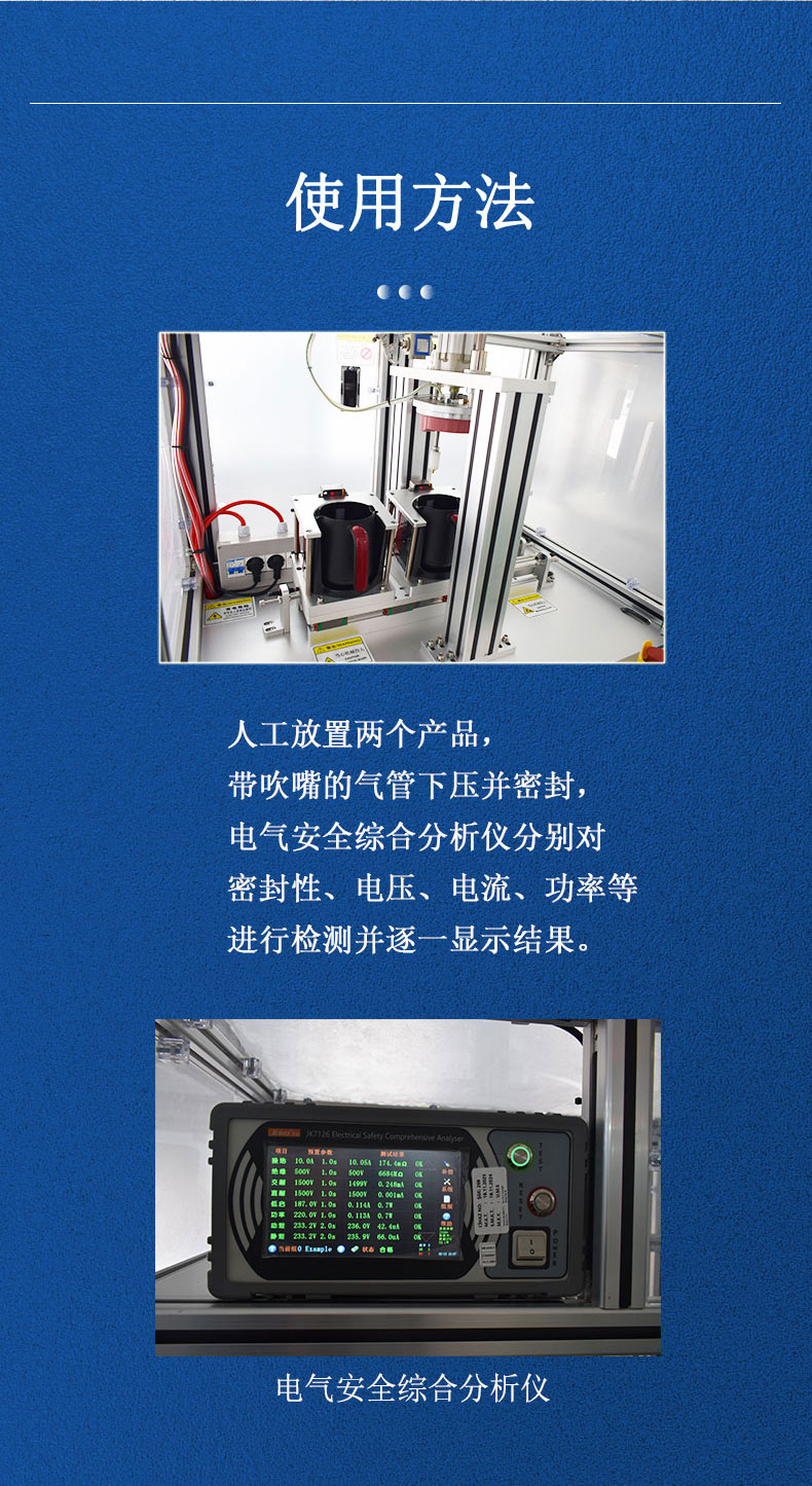 咖啡機(jī)密封性檢測(cè)、電力電壓電流檢測(cè)。人工放置兩個(gè)產(chǎn)品,帶吹嘴的氣管下壓并密封,電氣安全綜合分析儀分別對(duì)密封性、電壓、電流、功率等進(jìn)行檢測(cè)并逐一顯示結(jié)果。