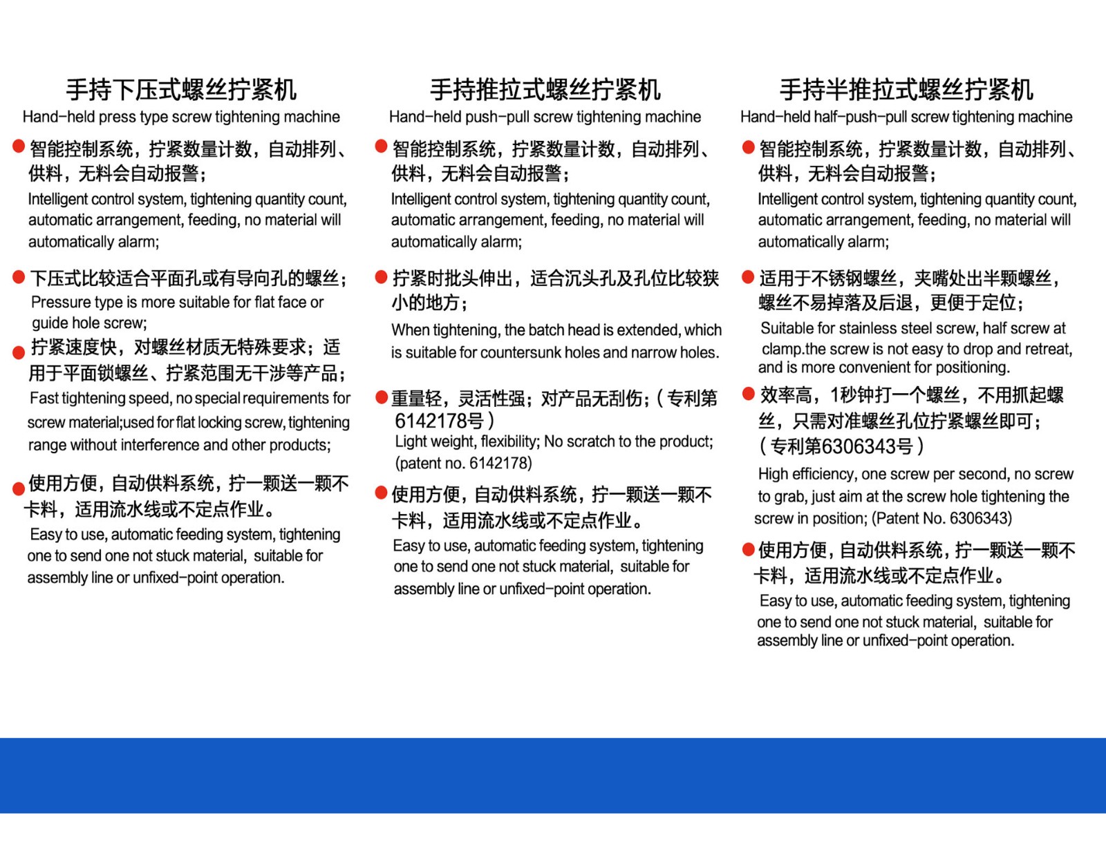 通用性強,使用方便,使用流水線或不定點作業。采用電磁感應信號送料控制,不會出現缺料或重復給料現象。大幅度提高螺絲鎖付效率,智能缺料報警系統,0.3S完成送料。